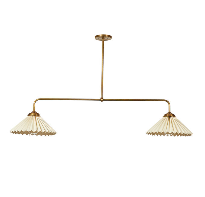 The Fan Chandelier is a two light linear pendant in unlacquered brass. It features a cream linen pleated shade.
